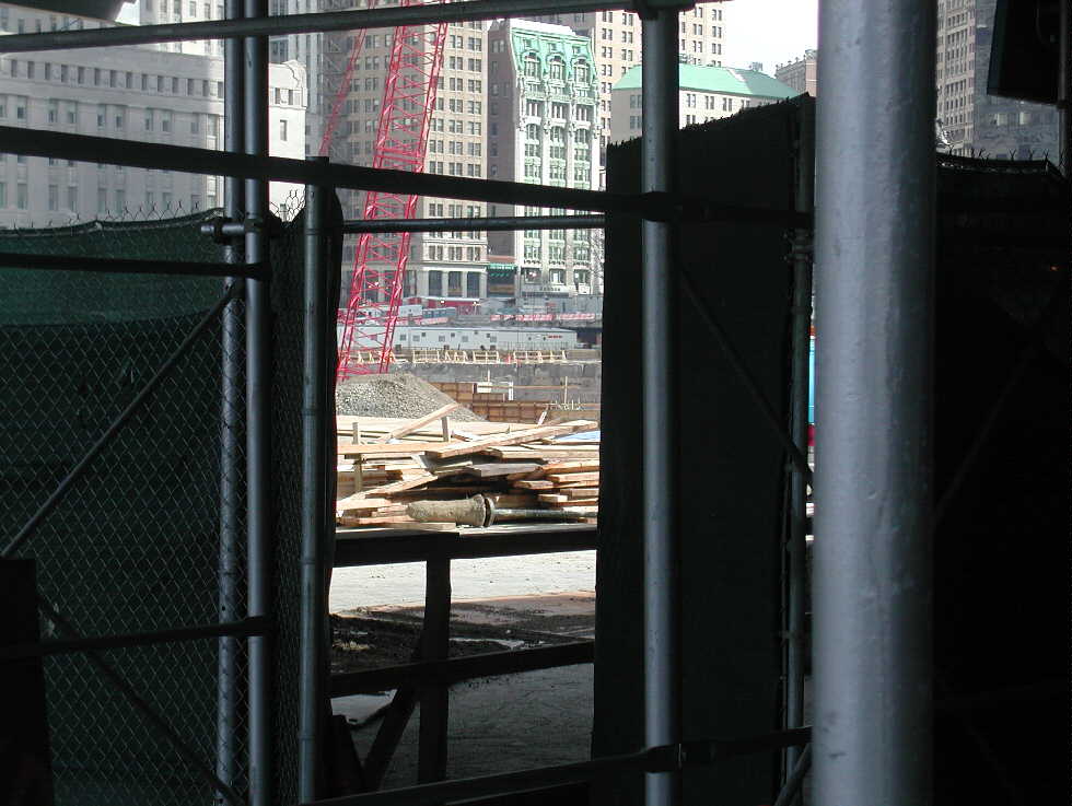 4 March 2002. Photo from the west side of the WTC site, looking through gap in protective fence; in the center distance is the red NY Fire Department trailer at the corner of Church and Vesey Street, shown in the photo above. Additional construction trailers are at a level below the street level, adjacent to the WTC pit. Formwork for a new concrete wall can be seen in the middle distance, its purpose unknown.
